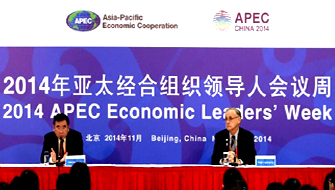 11月6日,APEC秘書處執行主任博拉爾德博士在吹風會上回答記者提問。當日,“2014中國APEC關鍵問題與倡議和APEC領導人會議周”吹風會在北京國家會議中心舉行!禔PEC經濟趨勢/貿易監測分析報告》也在會上發布。新華社記者 畢曉洋/攝