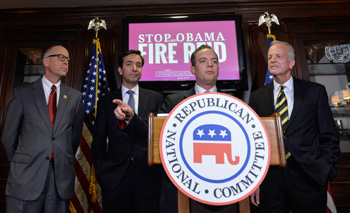 5日,在美國首都華盛頓,共和黨全國委員會主席賴因斯·普里伯斯(右二)在新聞發布會上講話!