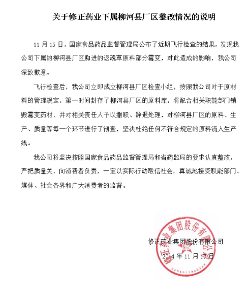 今日早間,修正藥業發布《關于修正藥業下屬柳河縣廠區整改情況的說明》,在該說明中,修正藥業表示,在國家食品藥品監督管理局發現相關問題后,修正藥業便成立了柳河縣廠區檢查小組,第一時間封存了柳河縣廠區的原料庫,此后將配合相關職能部門銷毀霉變藥材,并對相關責任人進行了撤職、辭退。