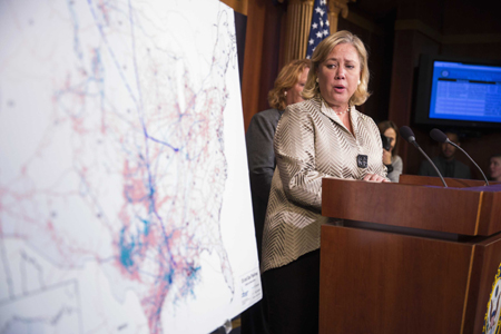 11月18日,批準建設“拱心石”XL輸油管項目的法案在美國聯邦參議院表決,結果59票贊成、41票反對,未能達到通過法案所需的60票門檻,以一票之差未能通過!肮靶氖盭L輸油管由加拿大管道公司建造,希望將加拿大艾伯塔省的油砂運往美國墨西哥灣沿岸煉油廠,但遭環保人士反對。圖為支持該項法案的參議員瑪麗·蘭德里歐在做最后的游說。