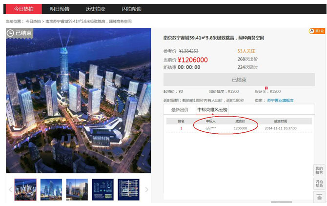 雙十一購物節如火如荼,正當大家都在尋找最敗家的女人時,在蘇寧第二屆O2O購物節上誕生了最“精明”的女人。11月11日10點,家住南京市玄武的周女士經過37分鐘的鏖戰,最終用她老公的賬號在蘇寧閃拍頻道以120.6萬的出價拍得價值138.4萬元的南京蘇寧睿城商業用房,這比市場價低了近18萬元。