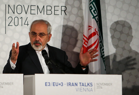 在24日于維也納結束的新一輪伊朗核問題談判未能達成協議,伊核問題六國和伊朗談判各方同意將談判延長7個月,到明年6月30日。談判延期避免了伊朗重啟核計劃的可能,也避免了西方如果恢復對伊朗的全面制裁可能對伊朗經濟造成的沖擊。英國外交大臣哈蒙德向外媒表示,在核談判延期的數月間,伊朗每月還將獲得約7億美元解凍資產。 圖為11月24日,在奧地利維也納,伊朗外長扎里夫出席新聞發布會。