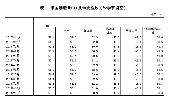 2014年11月,中國制造業采購經理指數(PMI)為50.3%,比上月回落0.5個百分點,但繼續高于臨界點,表明我國制造業總體上仍保持擴張態勢。