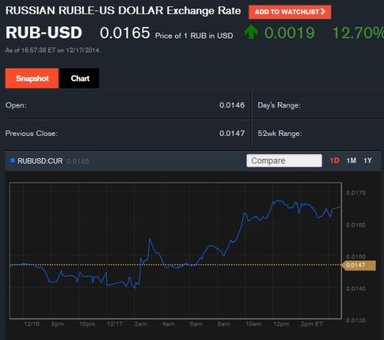 北京時間6點整,盧布兌美元報0.0165,漲幅為12.7%創1998年以來之最,盤中最高漲幅一度超16%。