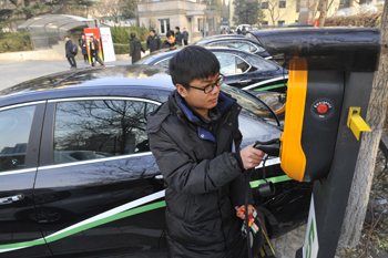 12月18日,科技部電動汽車分時租賃點啟動,一名工作人員在電動汽車分時租賃點檢查電動汽車的充電樁。 記者