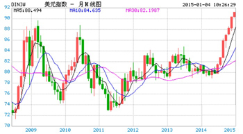 受益于美國經濟的溫和復蘇和美聯儲退出量化寬松的預期,美元在2014年下半年的外匯市場上獨占鰲頭,美元指數逼近八年高位。相比之下,新興市場貨幣則出現全盤下跌的局面,美元對一些貨幣的匯率創下金融危機以來最高水平。隨著美國經濟復蘇前景持續向好,美聯儲加息預期漸濃,預計2015年美元的上漲行情將繼續得到支撐,美元牛市在短期內仍將延續。