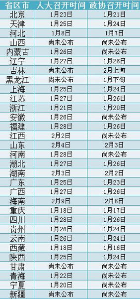 隨著1月7日、8日,河北政協和人大會議相繼召開,2015年地方兩會正式拉開帷幕。根據各地公布的會議日程,大部分省份兩會將集中在1月中下旬召開,最晚到2月上旬就會結束。