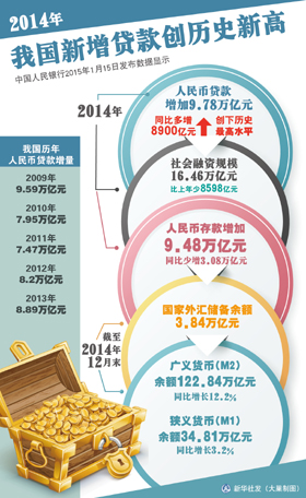 最新出爐的央行金融數據顯示,2014年社會融資規模為16.46萬億元,為歷史次高水平;人民幣貸款增加9.78萬億元,創歷史最高水平。不過,由于外匯占款的大量減少對貨幣增長形成較大下行壓力,年末M2增速下滑至12.2%,且并未達到年初13%的目標。