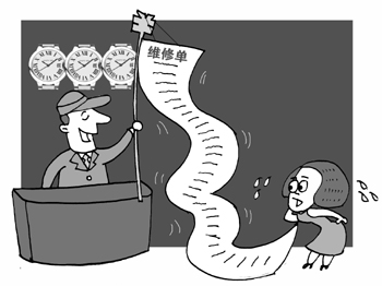 清單上的一系列維修建議讓王小姐頓時傻了眼!斑@塊戴了兩年的表平時走時非常精確,沒想到卻被從里到外檢出這么多問題!蓖跣〗愀嬖V《經濟參考報》記者,“最重要的是我根本就沒有同意讓他們檢測這些項目!