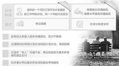 此外,已退休的“老人”仍將按照原辦法發養老金,同時執行基本養老金的調整辦法。胡曉義解釋說,這意味著“老人”的待遇不變,原來發多少錢還發多少錢,將來養老金調整的時候,還會跟著調整。但發放主體有了變化,過去由單位直接發放,今后將按照國家規定由改革后形成的基本養老保險基金支付。