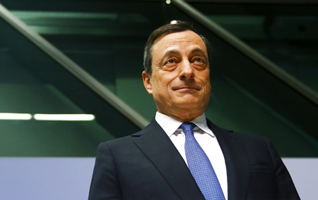 圖為當日歐洲央行行長德拉吉在德國法蘭克福出席新聞發布會。