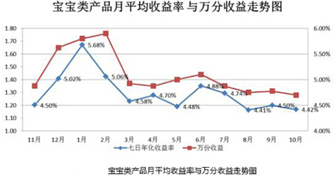 大數據君:不要說我沒提醒你。寶寶類產品的高收益神話正在破滅。請看大數據:2014年,寶寶類產品收益率不斷下降,7日年化收益率由2014年1月的6.5%-7.5%的收益區間跌至11月份4%-5%的區間范圍。