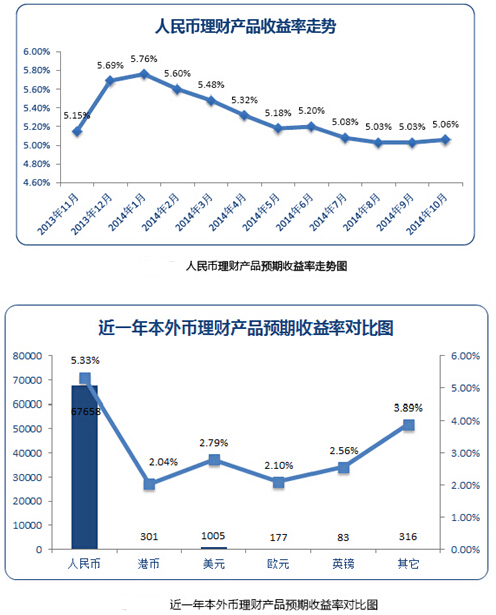 大數據君:嗯,銀行類理財產品收益率雖不比P2P,但風險也小啊。請看大數據:銀行類理財產品中,人民幣理財產品的平均預期收益率在監測周期內呈現出先揚后抑的走勢,在2014年1月達到最高的5.76%,隨后逐漸下滑,到2014年10月平均預期收益率僅為5.06%。外幣理財產品平均收益率小幅上升,主要貨幣中,美元的平均預期收益率較高,為2.79%。