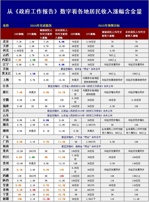 (表中數據來源于各省份2015年《政府工作報告》。其中,紅色數字為該項目最高值;藍色數字為該項最低值;綠色為CPI第二低;橙色數字表示該省份全年GDP增幅超過2014年全國GDP預期目標的7.5%,且收入增幅雙雙超過GDP增幅)