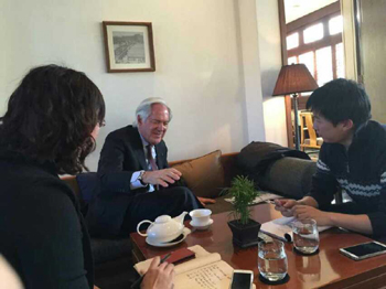 本報記者正在采訪羅蘭·貝格?悼