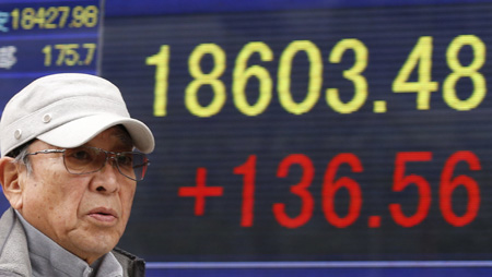 2月24日,一名男子經過日本東京街頭的股指顯示牌。 受日元持續小幅貶值等積極因素提振,24日東京股市連續第五個交易日收高,日經225種股票平均價格指數在收盤時比前一交易日上漲0.74%,再次刷新近15年最高紀錄。