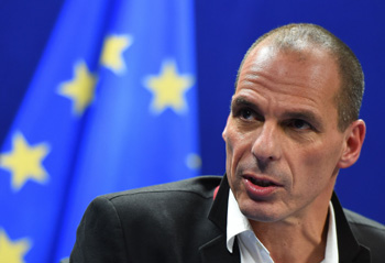 2月20日,在比利時首都布魯塞爾的歐盟總部,希臘財長瓦魯法基斯出席歐元集團特別會議后召開新聞發布會。新華社/法新 |