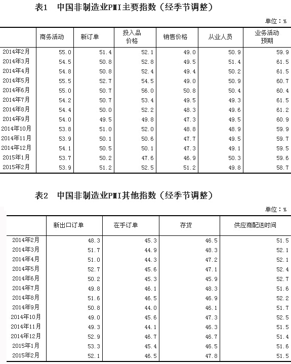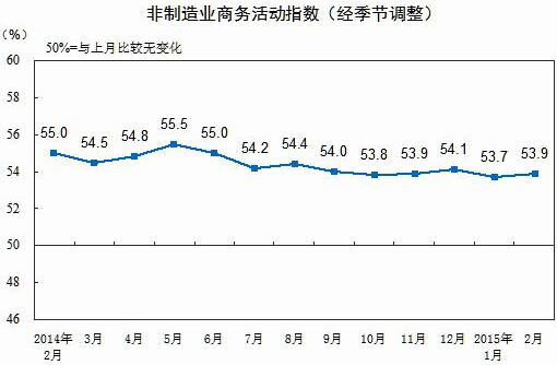 2015年2月,中國非制造業商務活動指數為53.9%,比上月上升0.2個百分點,高于榮枯線3.9個百分點,表明我國非制造業繼續保持平穩擴張勢頭。