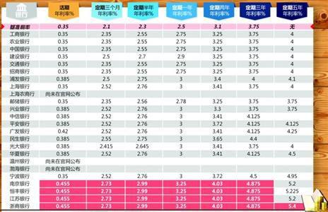 相較工、農、中、建、交等幾家大行,一些股份制銀行的存款利率上浮幅度要大得多。降息后不久,浙商銀行、恒豐銀行、南京銀行、江蘇銀行,便率先將所有期限存款利率在央行基準利率的基礎上,上浮30%,其中,浙商銀行的5年期存款利率更高達5.4%。而去年11月央行降息后,這幾家銀行也將各檔存款利率,一舉上浮至當時的1.2倍上限。目前上海市場的20余家主流銀行中,只有上海農商行、渤海銀行、溫州銀行等少數幾家銀行尚未更新利率。