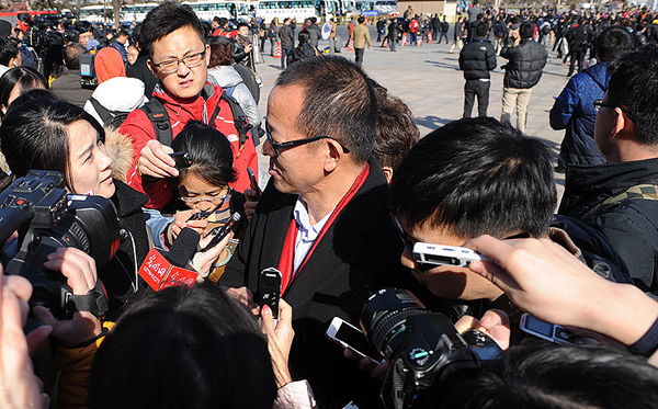 3月3日,中國人民政治協商會議第十二屆全國委員會第三次會議在北京人民大會堂開幕。這是記者們在人民大會堂東門外廣場采訪全國政協委員俞敏洪。 新華網 翟子赫 攝
