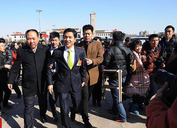 3月3日,中國人民政治協商會議第十二屆全國委員會第三次會議在北京人民大會堂開幕。這是記者們在人民大會堂東門外廣場拍攝全國政協委員李彥宏。 新華網 翟子赫 攝
