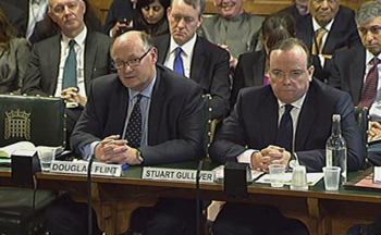 2月25日,在英國倫敦,匯豐控股集團主席范智廉(左)和行政總裁歐智華出席英國議會財政委員會聽證會。