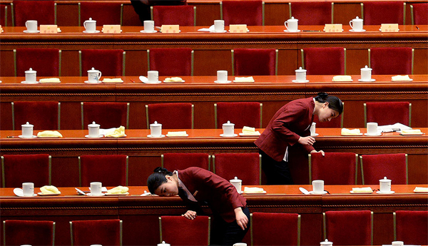 2015年3月3日,北京,全國政協十二屆三次會議開幕會在人民大會堂舉行。服務員在會后檢查會場。
