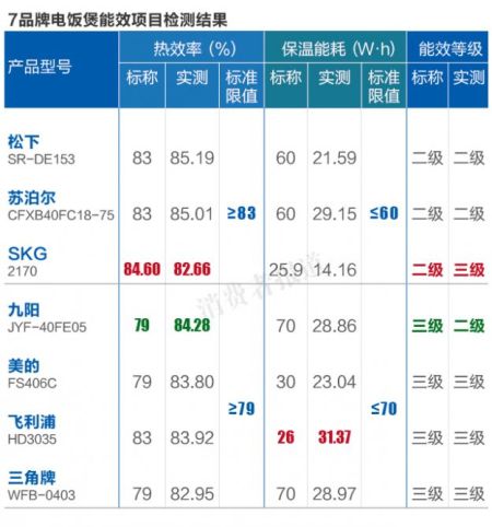 2015年1月,《消費者報道》對占據市場主流份額的SKG、飛利浦、美的、九陽、蘇泊爾、三角牌和松下等7品牌智能電飯煲的能效項目進行了檢測。結果顯示,SKG一款標稱為二級能效的電飯煲存在虛標情況;飛利浦電飯煲的實測保溫能耗則與標簽不符。