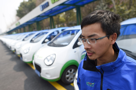 從3月16日起,杭州地鐵1號線江陵路站大型停車場內的“微公交”純電動汽車站點正式投入運營。這是目前杭州規模最大的“微公交”平面租賃站,可提供60輛微型純電動汽車。杭州從2013年9月起試運營“微公交”,目前已有“微公交”純電動汽車9851輛。圖為運營方一名工作人員站在“微公交”江陵路站內。