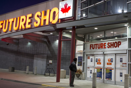 3月28日,加拿大最大消費電子產品連鎖店“未來商店”(Future Shop)的母公司百思買宣布關閉“未來商店”全部131家連鎖店,其中66家為永久關閉,另外65家改為百思買店。成立于1982年的加拿大“未來商店”在2001年11月被美國消費電子零售商百思買以5.8億美元收購。 圖為當日在加拿大多倫多,一名男子在一家“未來商店”連鎖店前閱讀貼在大門上的關門告示。