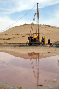 圖為在一處被污染的騰格里沙漠腹地,當地環保人員利用機井抽取不同層面的底泥與地下水樣本,為進一步評估、鑒定提供科學依據。
