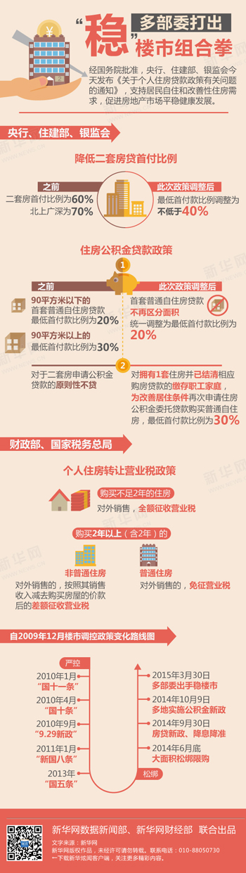 備受關注的“央版”房地產松綁政策正式落地。30日,央行、住建部、財政部、國稅總局等部門分別下發房地產新政以穩定樓市增長,包括二套首付降為40%,首套房公積金貸款首付降為20%,二套房公積金貸款首付降為30%;此外,個人出售2年以上住房免征營業稅。至此,加上上周剛剛落地的國土部與住建部發布的新政,中央方面對樓市已連下三劑猛藥。