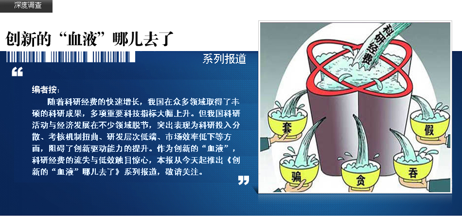 | 統計顯示,2006年以來,我國科研投入進入快速增長時期,2013年我國全社會研發投入已達1.19萬億元,占全球研發投入比重達到11.7%,規模居世界前列。多家科技型企業負責人對《經濟參考報》記者反映,隨著科技經費快速大幅增長,科研管理體制中的某些弊端也暴露無遺,一些政策縫隙被撕裂、政策漏洞被擊穿,科技投入中途截流、跑冒滴漏普遍,甚至被套取挪用。 | |