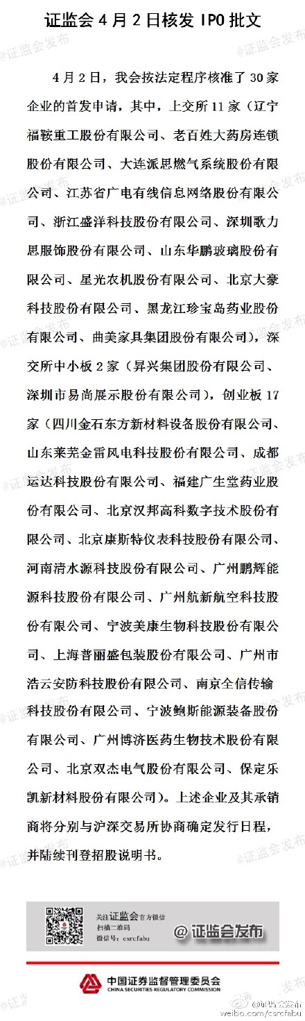 記者從證監會獲悉,4月2日,證監會按法定程序核準了30家企業的首發申請,其中,上交所11家,深交所中小板2家,創業板17家。