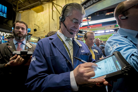 4月1日,交易員在美國紐約證券交易所工作。 受當天經濟數據疲弱影響,紐約股市三大股指1日齊下跌。截至收盤,道瓊斯工業平均指數比前一交易日下挫77.94點,收于17698.18點,跌幅為0.44%。標準普爾500種股票指數下跌8.20點,收于2059.69點,跌幅為0.40%。納斯達克綜合指數下跌20.66點,收于4880.23點,跌幅為0.42%。