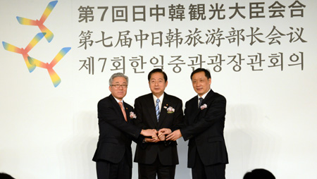4月11日,在日本東京,中國國家旅游局局長李金早(右)、日本國土交通大臣太田昭宏(中)與韓國文化體育觀光部長官金鐘德合影。 第七屆中日韓旅游部長會議4月11日在東京開始為期兩天的議程。12日,會議發表聯合聲明,表示將以開啟中日韓旅游交流新時代的大幕為契機,作為共同旅游目的地,聯合推廣“游歷東方”旅游活動,以吸引東亞地區之外的游客。