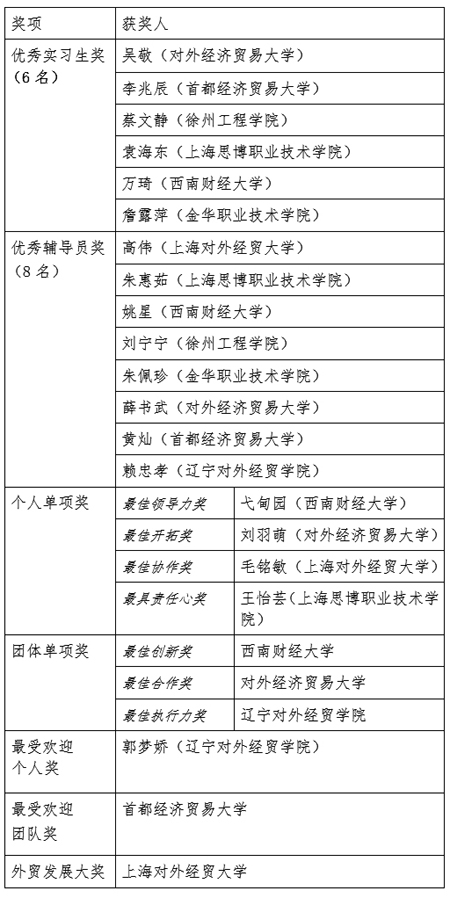 活動還頒發了“外貿發展大獎”、“最佳創新團隊”、“最佳合作團隊”、“最佳領導力獎”、“最佳開拓獎”等2014年度12335商務知識競賽復賽和決賽相關獎項,來自上海對外經貿大學、西南財經大學、對外經貿大學等多所大學的學生團隊和個人獲得獎勵。