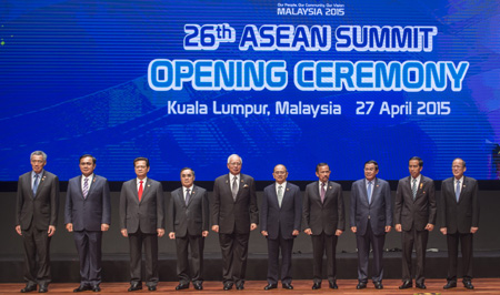4月27日,在馬來西亞吉隆坡,與會領導人在東盟領導人會議開幕式上合影。當日,第26屆東盟領導人會議在馬來西亞吉隆坡開幕。會議的主要目標是確保東盟共同體在今年年底前如期建成,商討制定東盟在2015年后的發展愿景。