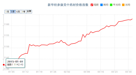 2015年第一季度,雖然由于春節緣故各大中藥材市場都進行了短暫的閉市休整,但是“新華經參康美中藥材價格指數”仍以上漲為主旋律,隱隱擺脫了2014年下半的小幅震蕩走勢,尤其是2015年3月份指數雖然每天上漲幅度不大,但是在連續的上漲,截止2015年4月1日,指數收于1163.06點,與2015年1月1日相比上漲20.63點,同比上漲1.81%。從各大藥材市場反映來看目前市場交易氣氛不是很強烈,主要由于部分品種價格回升和供給影響對價格指數上漲有一定的支撐和推動作用,預計后續在沒有大的行情推動下仍然以小幅波動為主。