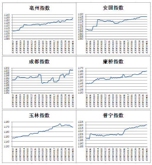 2015年第一季度,亳州、安國、成都、廉橋、玉林、普林6大市場價格指數走勢基本與與整體走勢一致,尤其是亳州走勢基本吻合。從下圖各大市場具體走勢來看,玉林近期指數違反常規走勢出現下跌情況,其主要原因是玉林中藥材市場主要集中香料這一塊,由于近期香料狀況普遍下跌所致。2015年第一季度6大市場指數走勢如圖2所示。