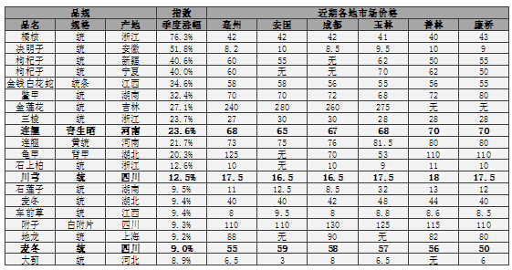 2015年第一季度價格指數漲幅最大是品種是橘核,規格統產地為浙江,指數漲幅達到76.3%,橘核價格大幅上漲主要受到供給影響,原因是目前產地缺貨,但是產新還有相當長一段時間,而且市場需求一直尚可,從而導致近期價格的持續上漲,預計短期內行情可能會持續小幅上升,近期6大中藥材市場橘核價格基本在40元以上。另外近期值得關注連翹規格青生曬產地河南的價格指數上漲23.6%,川芎統四川上漲12.5%,麥冬統四川指數上漲9%。一季度價格指數漲幅排名前二十具體品規以及各市場參考價格如表1所示。