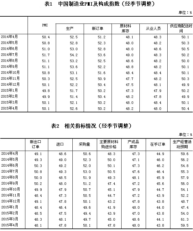 2015年4月,中國制造業采購經理指數(PMI)為50.1%,與上月持平,連續兩個月高于臨界點。