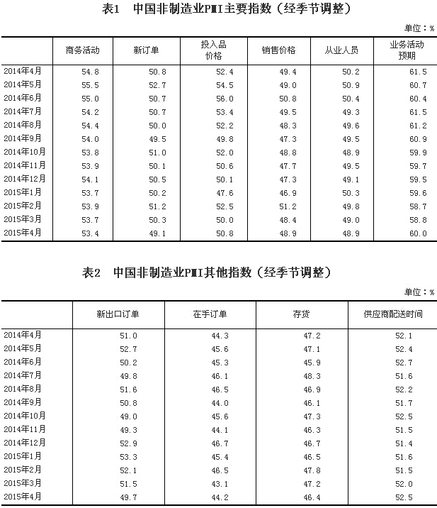 自2015年起,非制造業PMI發布時間由原來的每月3日變更為每月1日;同時,為了使公眾更容易理解指標含義,將原“中間投入價格指數”改為“投入品價格指數”,原“收費價格指數”改為“銷售價格指數”。