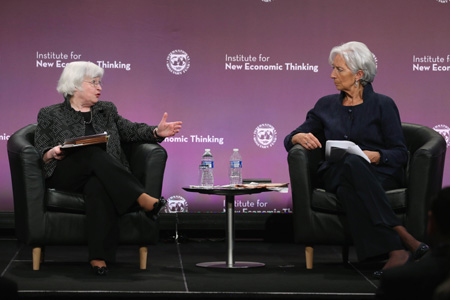 當地時間5月6日,美國首都華盛頓,國際貨幣基金組織總裁拉加德(右)和美聯儲主席耶倫出席對話活動。