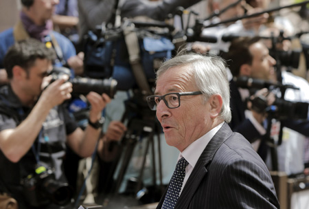 5月11日,歐盟委員會主席容克抵達比利時首都布魯塞爾的歐盟總部,出席歐元區財長會議。
