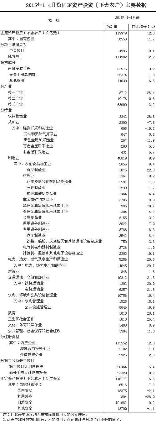 2015年1-4月份,全國固定資產投資(不含農戶)119979億元,同比名義增長12.0%,增速比1-3月份回落1.5個百分點。從環比速度看,4月份固定資產投資(不含農戶)增長0.89%。