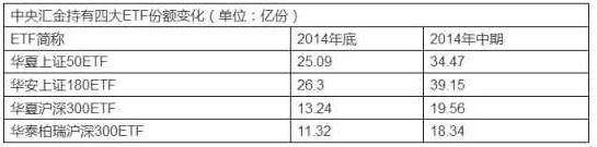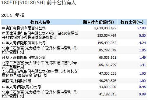 華安上證180ETF2014年年報顯示,截至去年底,中央匯金有限責任公司共持有上證180ETF高達26.3億份,占該ETF總份額的57.08%,為其最大單一持有人。