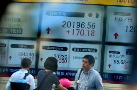 5月20日,在經濟數據利好、日元對美元匯率下跌等多重利好因素提振下,日本東京股市高開高走,日經225種股票平均價格指數實現4連陽,創2000年4月以來最高收盤點位。至收盤時,日經股指上漲170.18點,收于20196.56點,漲幅為0.85%。圖為行人站在東京證券交易所外的電子股指顯示屏前。