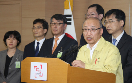 5月31日,在韓國首爾,韓國保健福祉部長官文亨杓(前)在記者會上發言。 韓國保健福祉部長官文亨杓31日召開記者會,就韓政府部門對中東呼吸綜合征的傳染性估計不足、沒有妥善監控與首位韓國患者密切接觸者表示道歉,并表示政府將全力以赴防止新發病例感染他人。
