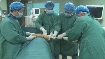 文登整骨醫院醫護人員在為橈骨頸骨折患者行骨折閉合穿針內固定術。資料照片 |